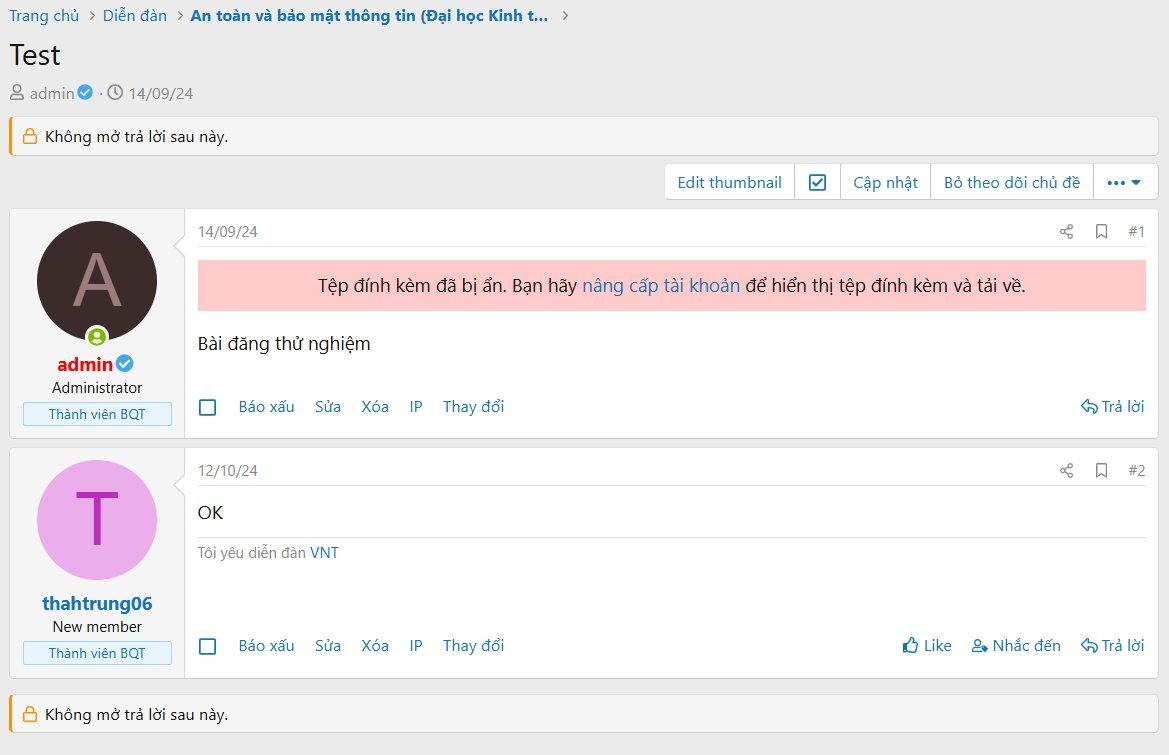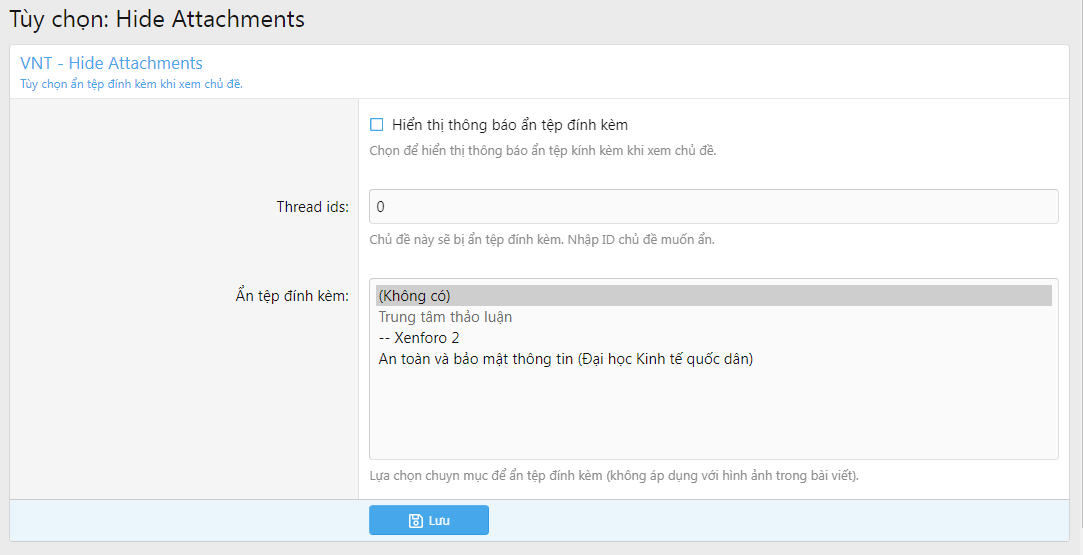 Mặc định, các nhóm thành viên sẽ không bị ẩn tệp đính kèm. Cần phải phân quyền cho từng nhóm thành viên để lựa chọn nhóm nào sẽ bị ẩn tệp đính kèm, có thể thêm id một chủ đề cụ thể sẽ bị ẩn tệp đính...