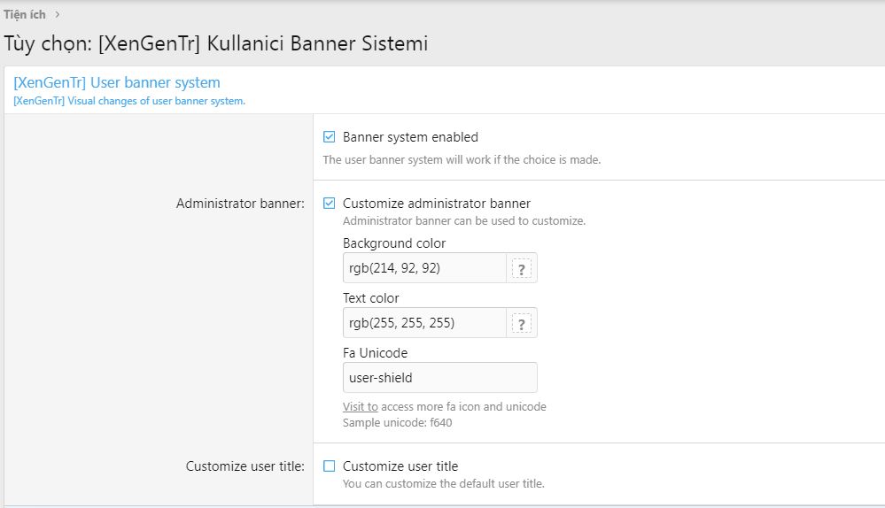Đây là phiên bản được tùy chỉnh lại từ phiên bản 1.0.1 để hỗ trợ cho XF 2.3, theo cách thức hiển thị Font Awesome mới.Tùy chỉnh banner người dùng của bạn một cách dễ dàng.