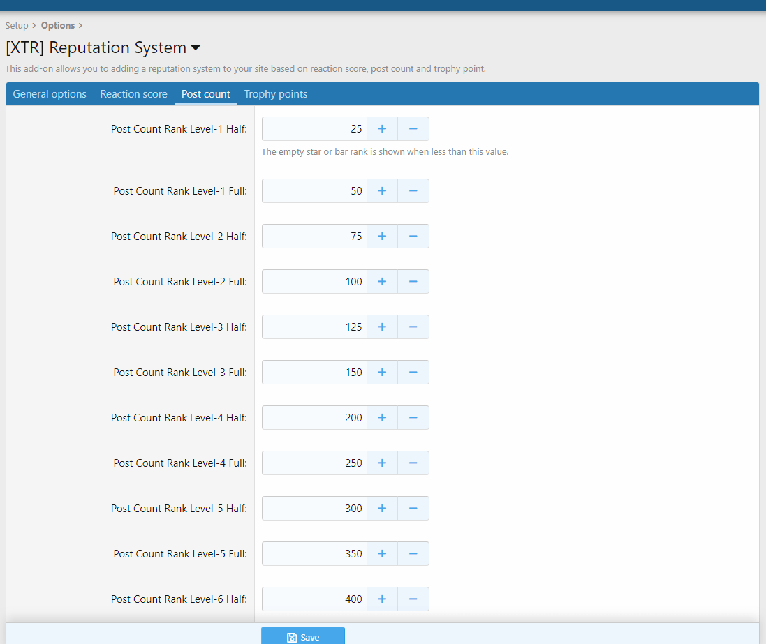 Add-on này cho phép bạn thêm một hệ thống danh tiếng vào trang web của mình dựa trên điểm reaction, số lượng bài viết và điểm trophy.